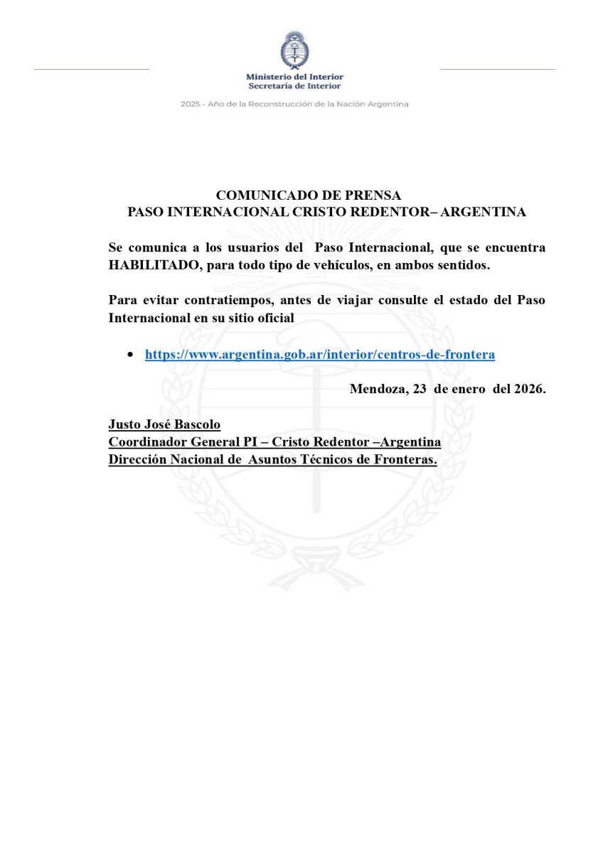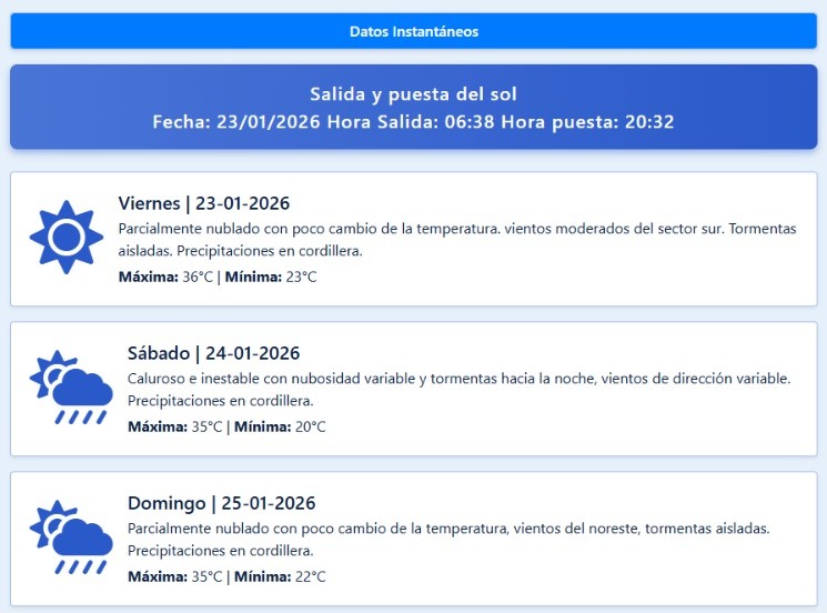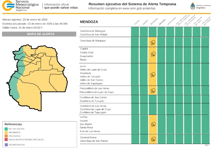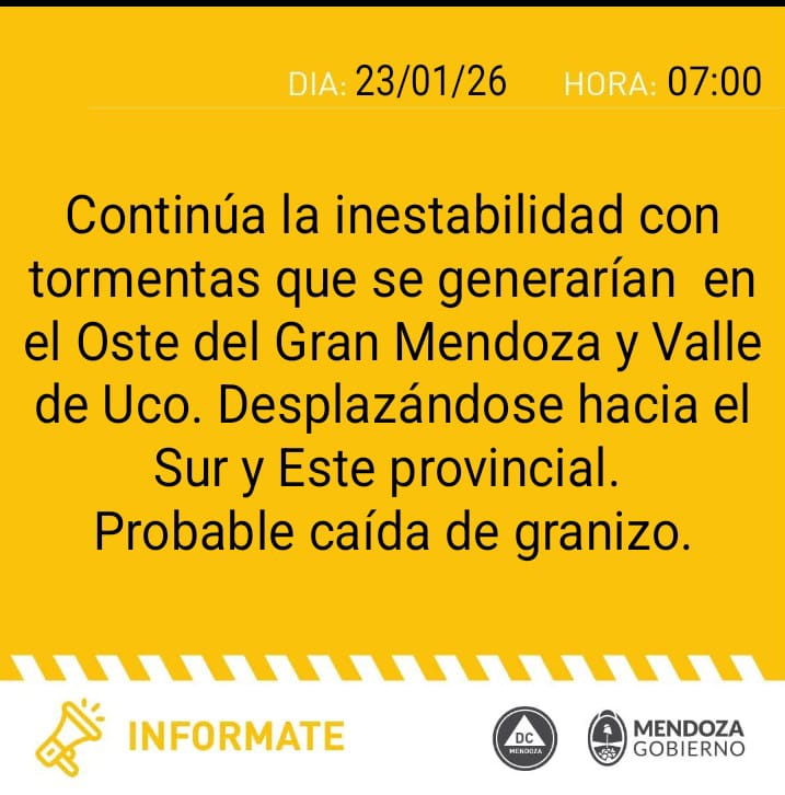 Nubosidad: Cielo despejado durante la mañana. A partir de las 16:00, inicio de tormentas en el Oeste del Valle de Uco y Oeste del Gran Mendoza. Posteriormente, se extenderán a toda la zona Sur y al Gran Mendoza. En la noche del Sábado, se podrían registrar tormentas significativas en el Gran Mendoza con probabilidad de granizo, fenómeno que también podría afectar a la provincia de San Juan hacia la noche y madrugada.