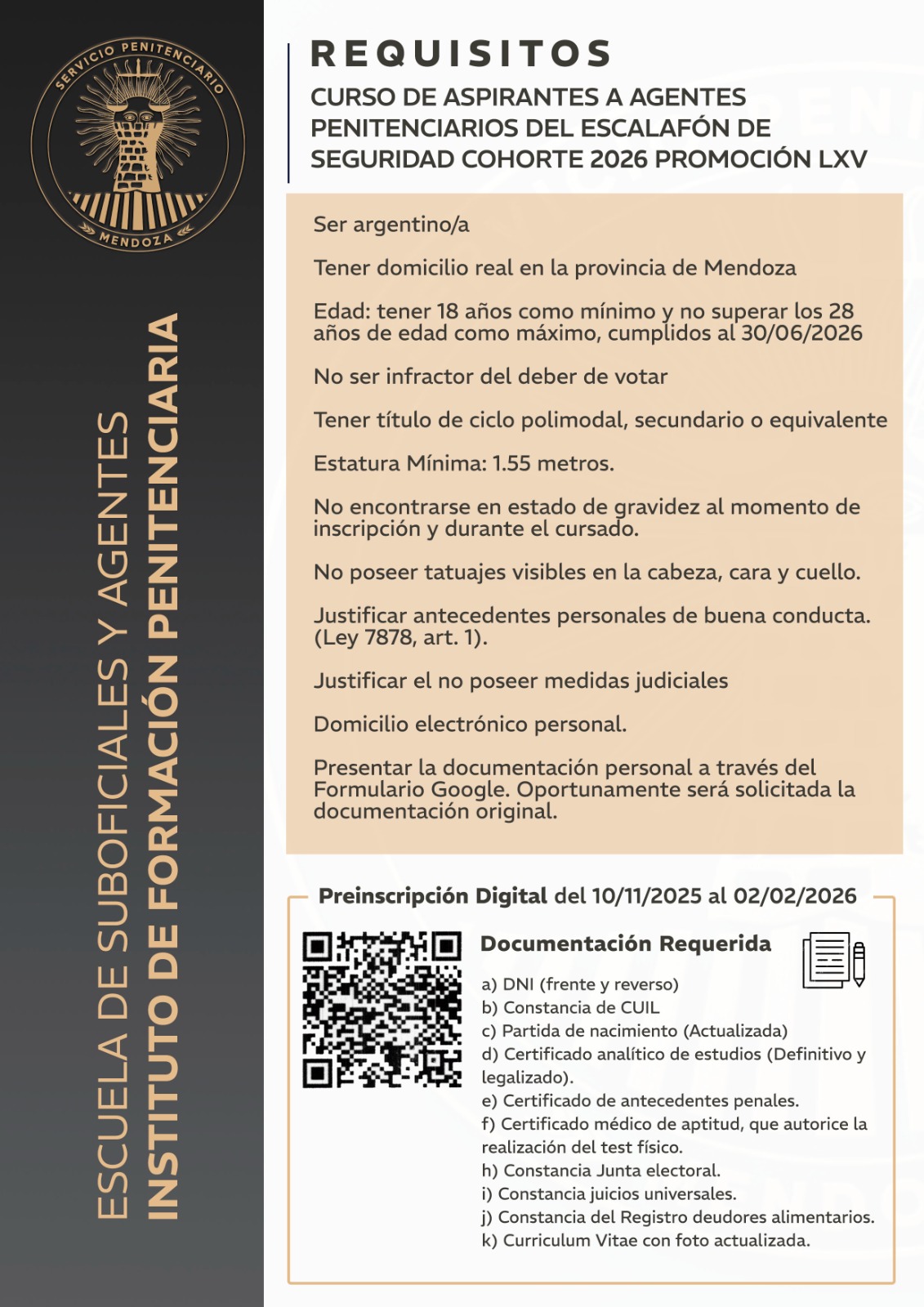 El Servicio Penitenciario de Mendoza da inicio al proceso de inscripción correspondiente a la Convocatoria de Aspirantes para Agentes del escalafón de Seguridad, cohorte 2026, promoción LXV. La modalidad es por internet, completando un formulario digital, a partir del lunes 10 de noviembre.
