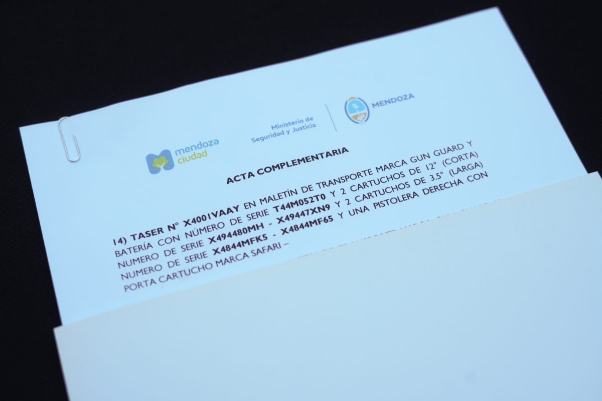En ese momento, se firmó el acta de entrega de 15 de las 30 Taser que serán destinadas al cuerpo de seguridad ciudadana de la Ciudad de Mendoza. En esta primera etapa, nueve preventores recibieron los dispositivos tras haber completado la capacitación dictada por las Fuerzas de Operaciones Especiales.