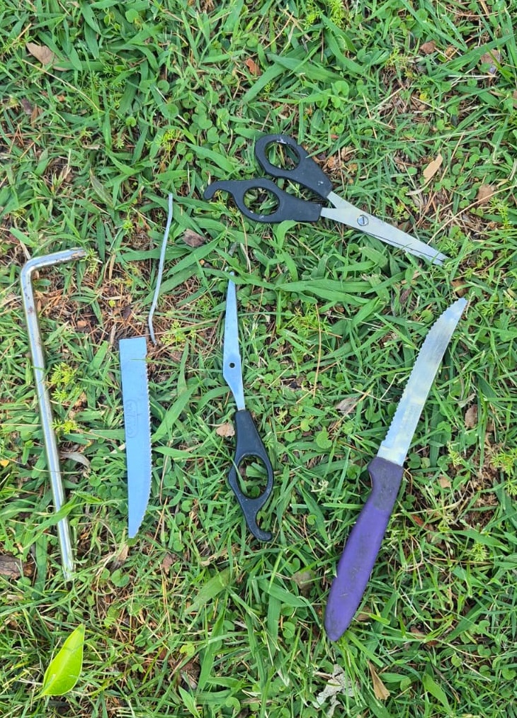 La intervención se produjo en la intersección de avenida Boulogne Sur Mer y avenida Libertador, donde los uniformados observaron al joven en actitud sospechosa. Tras identificarlo y efectuar el control de seguridad, constataron que llevaba un cuchillo de 20 centímetros (10 centímetros de hoja), una tijera con hoja de 15 centímetros y una llave en forma de “L”, todos elementos punzantes o con filo.