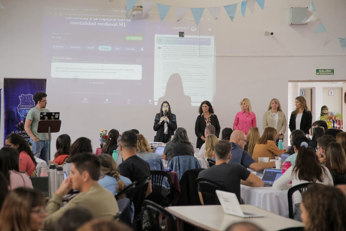 Romina Méndez, coordinadora del programa Edutec, explicó que la Provincia trabaja dentro del sistema educativo con cuatro plataformas: Mendoza Aumentada (FlexFlit), Eduten, Matific y Cumbre que es una plataforma de inglés. “Con Mendoza Aumentada trabajamos con estudiantes de primero a tercer año y próximamente vamos a trabajar con los estudiantes de cuarto y quinto año en un programa de operados de IA”, informó Méndez, y explicó que la plataforma de inglés Cumbre permitirá estudiar teoría, completar actividades y realizar exámenes.