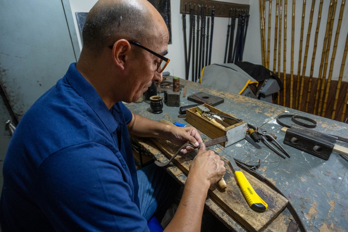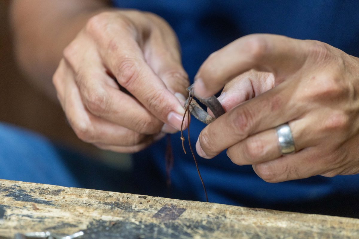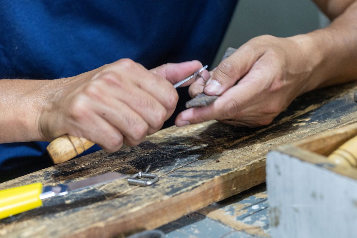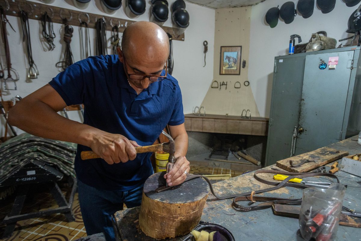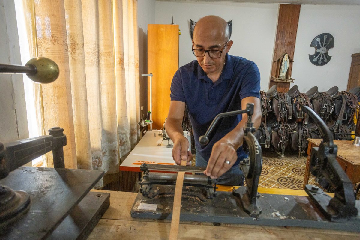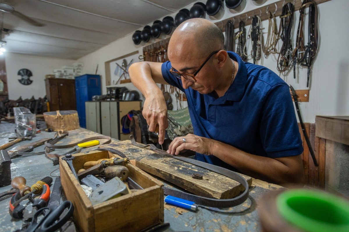 Cabezas, riendas, pretales, correajes, cinturones, pistoleras, portacargadores, tiros de sable y distintos atalajes de cuero se fabrican en el taller a partir de materia prima en bruto. “Llega la suela entera, se longea, se corta y se trabaja todo a mano. No hay nada industrializado. Es un oficio que no se aprende en una escuela: se transmite de generación en generación”, detalla.