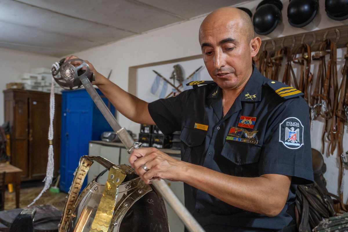 La tarea no se limita al equipamiento operativo. En la sección también se conservan piezas de alto valor histórico que siguen en uso ceremonial. Olivares tiene a su cargo el mantenimiento de los uniformes y corazas de la sección de Coraceros, creada durante la gobernación de Emilio Civit, a comienzos del siglo XX. Su función principal es la custodia de honor del Poder Ejecutivo provincial, acompañando al gobernador en actos oficiales cuando el protocolo lo dispone.