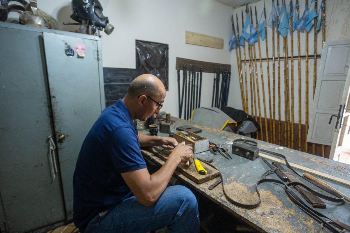 Olivares integra el Cuerpo de Caballería General Martín Miguel de Güemes desde 2015 y, desde 2018, está a cargo de la sección de talabartería. “Mi función es mantener y confeccionar todo el equipamiento que se usa tanto en los servicios diarios como en los especiales”, explica. Allí se trabaja sobre elementos provistos por el Estado —como monturas, mandiles o sudaderas— pero también se elabora desde cero una gran parte del equipamiento que utilizan los efectivos y los caballos.