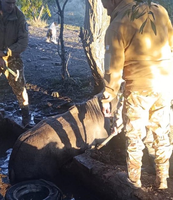 Al arribar, los uniformados constataron que una yegua de pelaje lobuno había caído a una pileta de aproximadamente un metro de profundidad, sin posibilidad de salir por sus propios medios, por lo que se montó un operativo de rescate.
