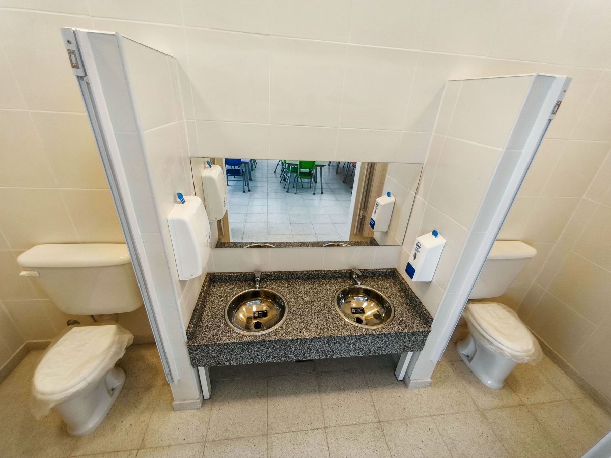 Sobre una superficie de 108 metros cuadrados cubiertos, se edificaron ambos núcleos, cada uno con sanitarios, lavabos, piletón, guardado y patio individual.
