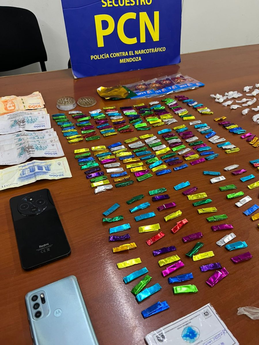 En tanto, otro procedimiento se desarrolló en calle Misiones, en el departamento de Guaymallén. En el lugar, los efectivos policiales incautaron 210 envoltorios de papel glasé con clorhidrato de cocaína, con un peso total de 115 gramos; una bolsa de nylon con 17,5 gramos de cocaína compactada; 25 bolsas con flores de cannabis sativa, con un peso total de 36,1 gramos; y otra bolsa con flores de cannabis, con un peso de 6 gramos. Además, se secuestraron dinero en efectivo, teléfonos celulares y documentación de interés para la causa. Una mujer quedó a disposición de la Justicia.