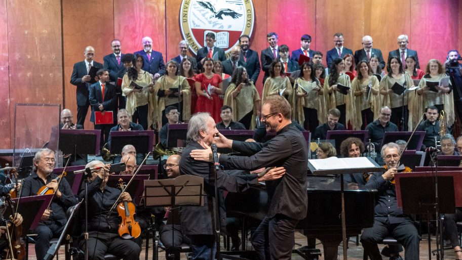Ante una Sala Roja colmada —y con Serrat ubicado en primera fila—, tomaron su lugar en el escenario la Orquesta Sinfónica y los Coros de Cámara y de Jóvenes de la UNCuyo. Con el avance del programa se sumaron las voces solistas invitadas de Gabriela Fernández y Nahuel Jofré.