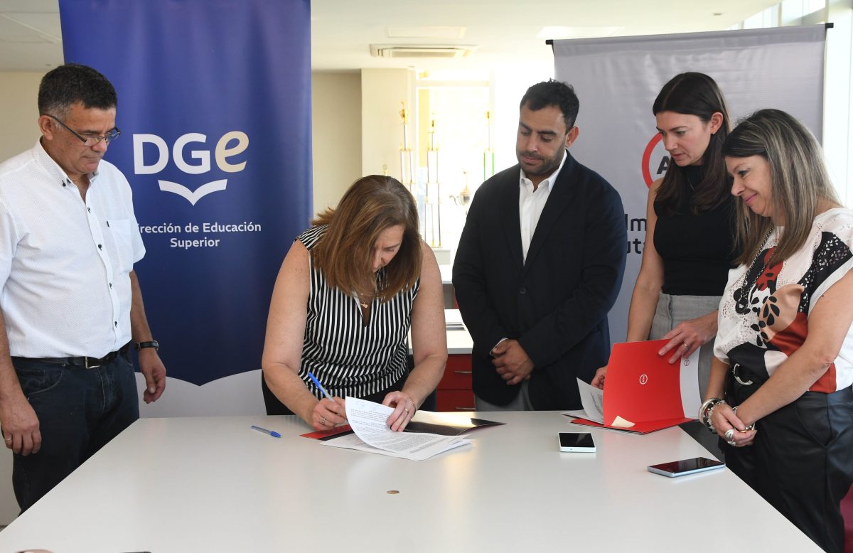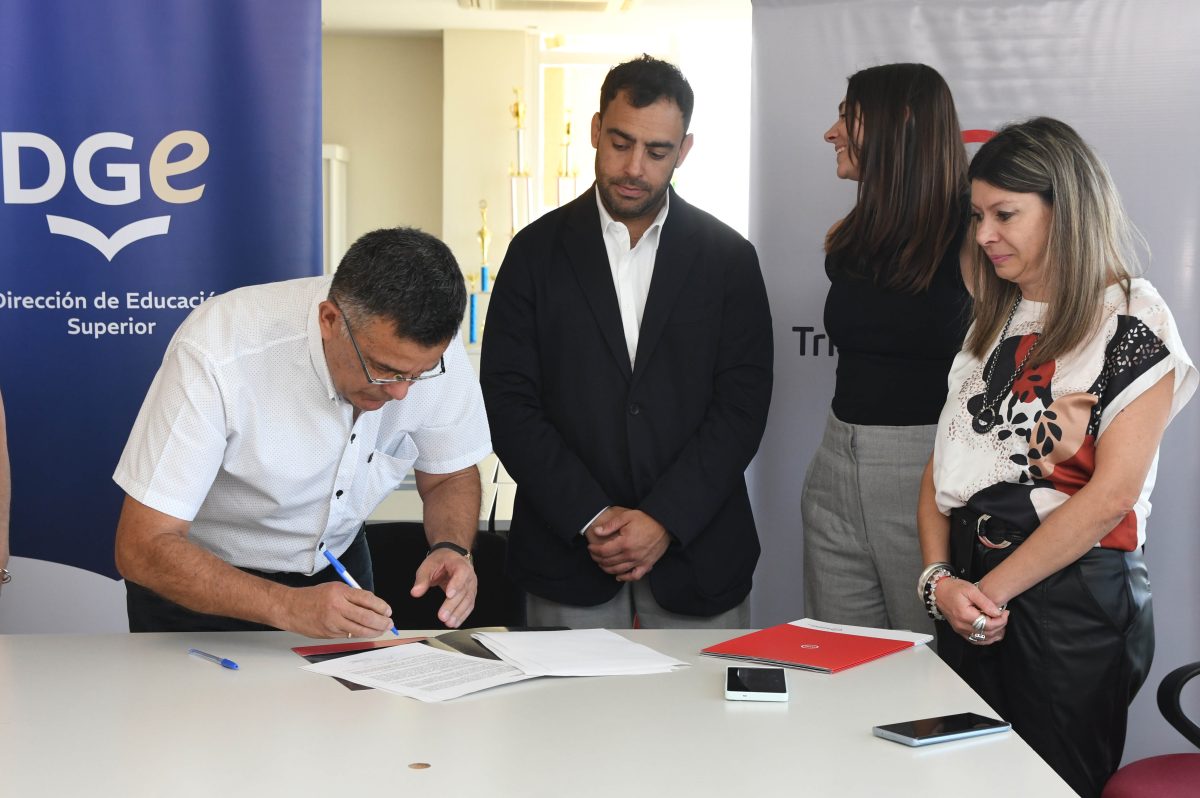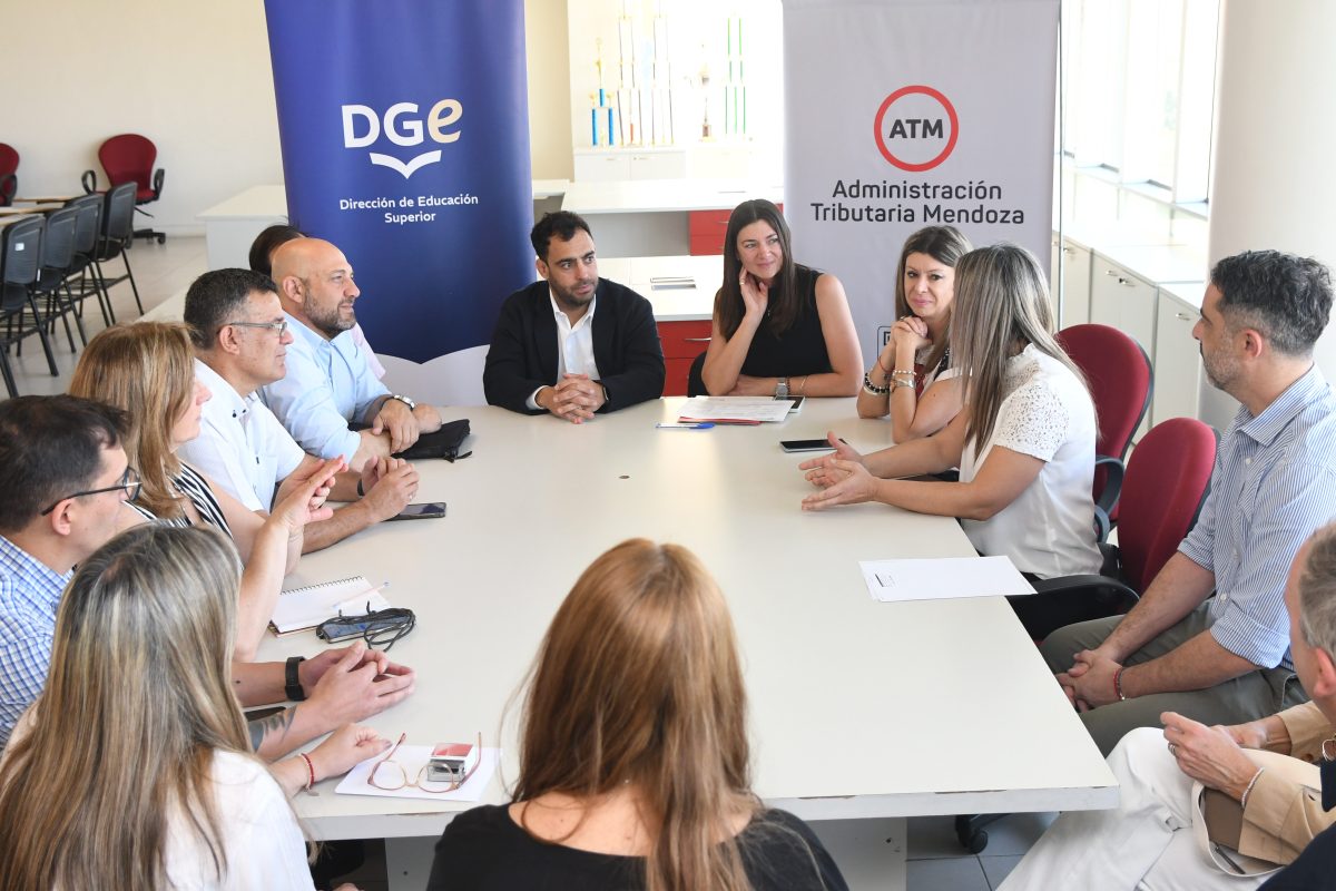 La Dirección de Dirección General de Escuelas (DGE) firmó este miércoles un convenio con Administración Tributaria Mendoza (ATM) para que estudiantes de cuatro Institutos de Educación Superior puedan realizar pasantías en el organismo y, de este modo, fortalecer la formación de los futuros profesionales. La firma, que tuvo lugar en el edificio de ATM, participaron el director de esa entidad, Nicolás Chaves, y la directora de Planeamiento y Control de Gestión, Victoria Panella. Por parte de la DGE firmaron la directora de Educación Superior, Mariela Ramos, y autoridades de las instituciones educativas.