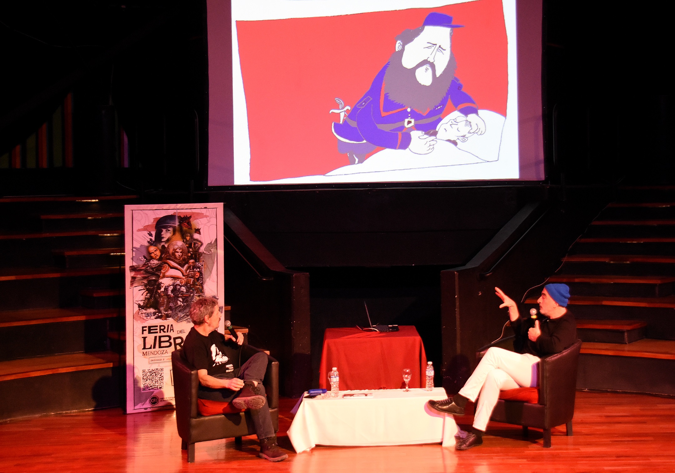 Por su parte, Miguel compartió la experiencia de dar forma visual a la propuesta, marcando su distancia con el clásico poema gauchesco: “A mí un par de veces me ofrecieron dibujar el Fierro… pero nunca le entré porque carece de humor. En cambio, cuando recibí el texto de Martín y el recitado, encontré que había humor y entonces lo emprendí”. Uno de los momentos más llamativos fue cuando relató cómo trasladó episodios históricos al dibujo: “Esto que contaba Martín, que Hernández estaba en una habitación frente a Casa de Gobierno, cuando Sarmiento era presidente, y que se aburría y escribía el Martín Fierro, yo lo hice en una viñeta a doble página. Hernández mirándolo a Sarmiento, que lo ignoraba desde el Hotel Argentino”.