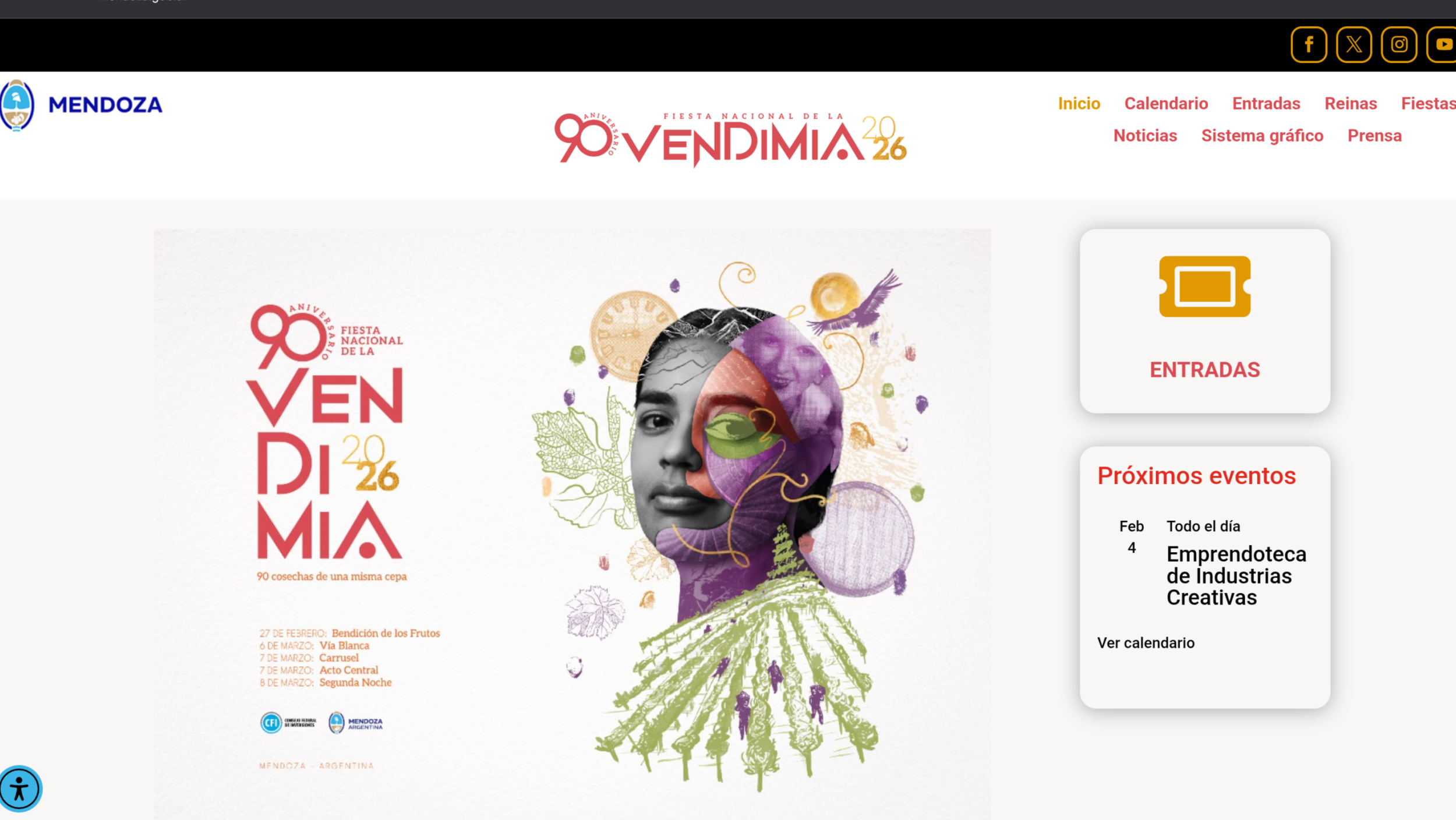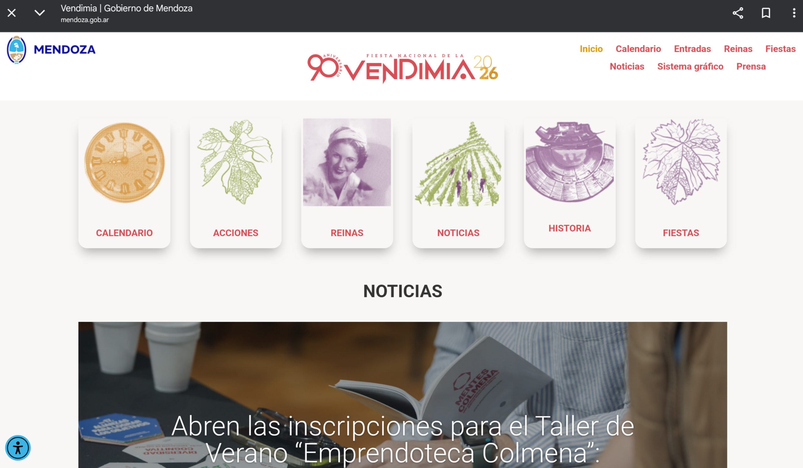 En la página se ofrecen noticias relacionadas con el calendario vendimial, con información sobre los principales hitos de la fiesta y las actividades que se desarrollan a lo largo de la temporada. Además, incluye un calendario de eventos culturales que reúne celebraciones departamentales, espectáculos y propuestas especiales vinculadas a la Vendimia.