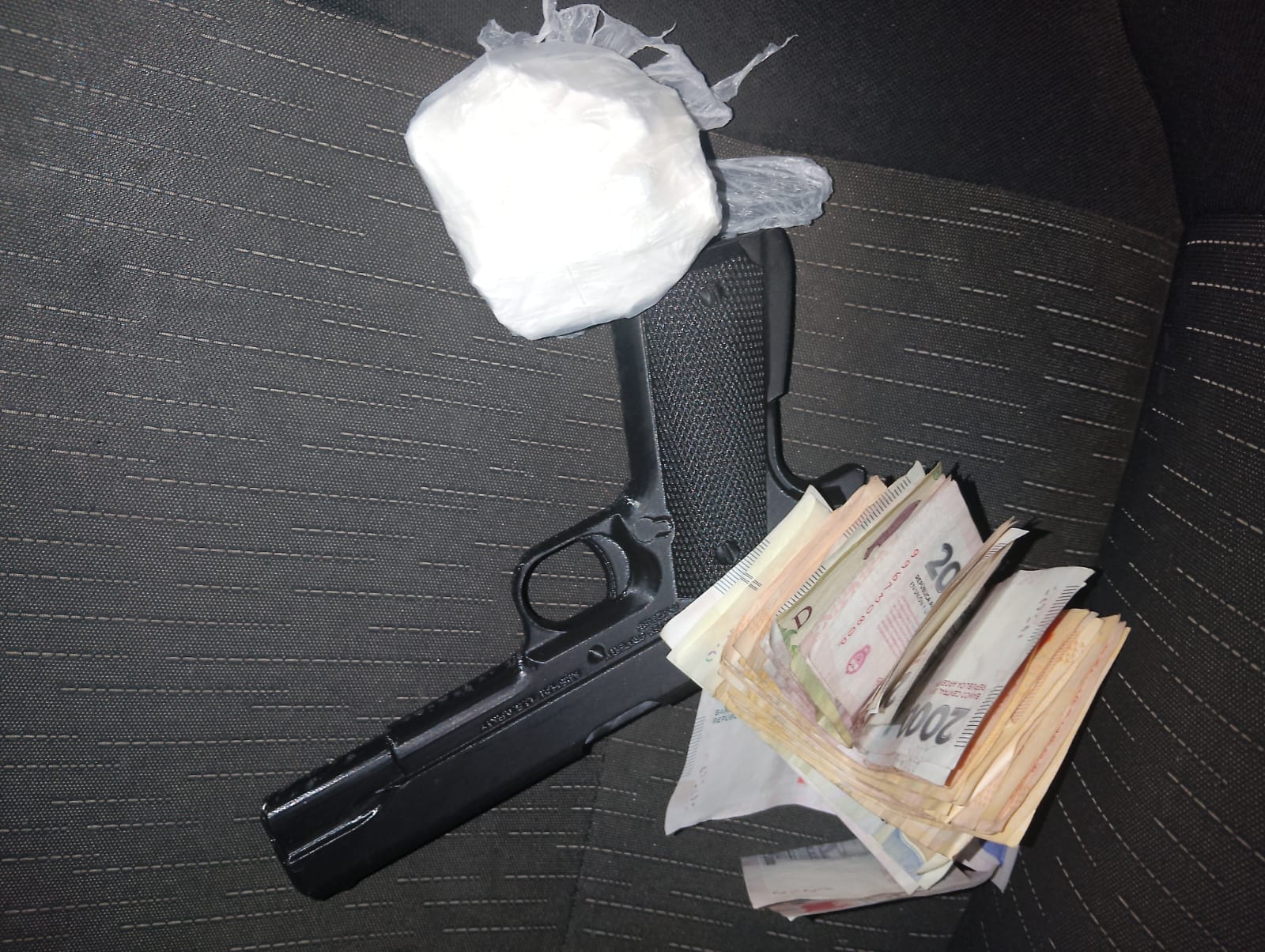 Al requisar el vehículo, la Policía secuestró un arma de fuego, una sustancia blanquecina compacta —de características compatibles con estupefacientes— y dinero en efectivo.