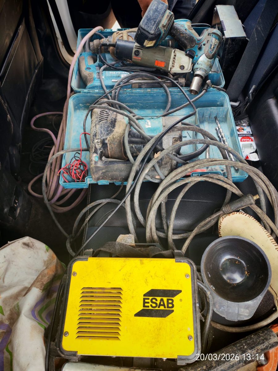 En el interior del rodado, los efectivos encontraron herramientas industriales de dudosa procedencia, como dos rotopercutores, un martillo eléctrico, una amoladora, una estación de carga de batería, una atornilladora de impacto a batería, una máquina de soldar, una pinza porta electrodo, un nivel de mano, cables varios y prendas de vestir. Los sospechosos, de 42 y 28 años, fueron trasladados a la dependencia policial.