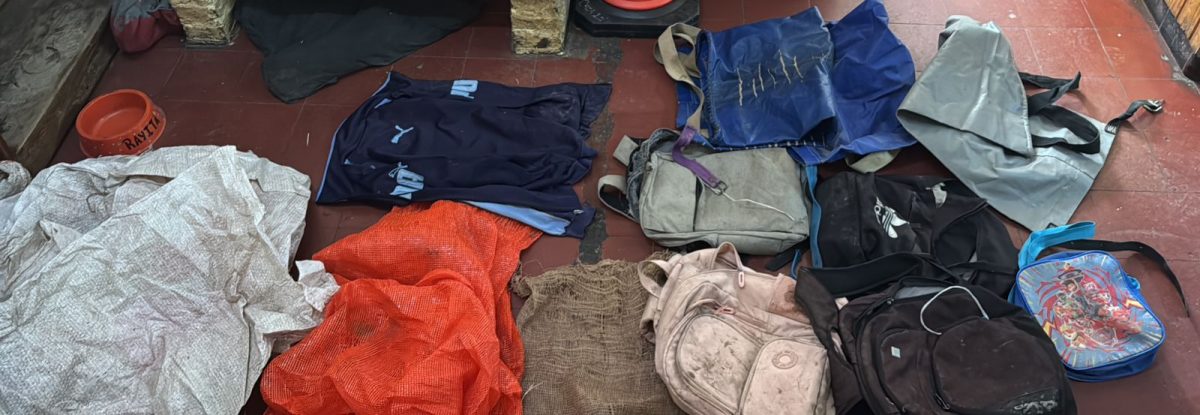 Tras un rastrillaje en el lugar, se hallaron y secuestraron cuatro mochilas, un morral, prendas de vestir, tres recolectores y 17 bolsas de arpillera, elementos que quedaron a disposición de la Oficina Fiscal.
