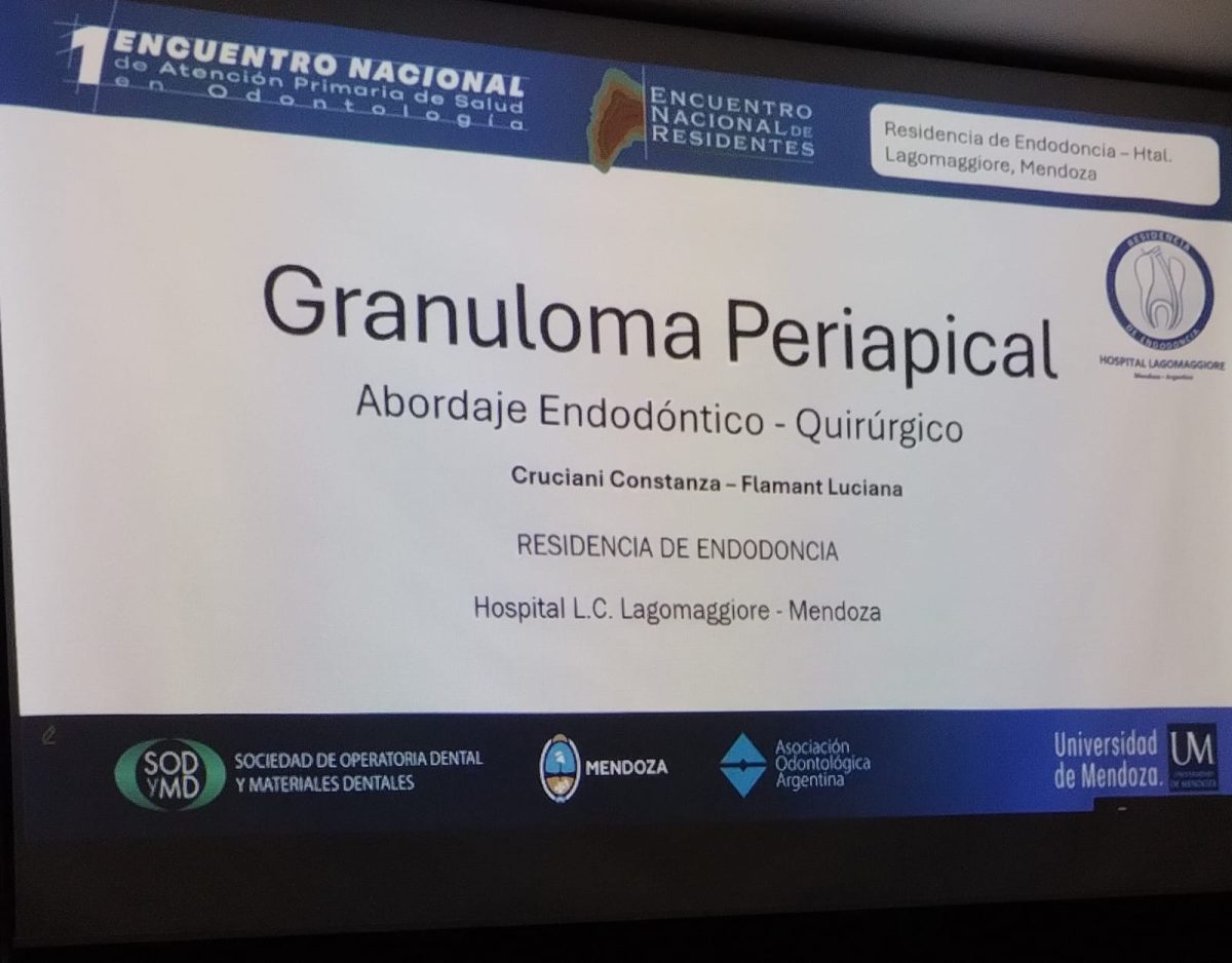 El premio fue otorgado al trabajo titulado “Granuloma periapical: abordaje endodóntico quirúrgico”, realizado por Constanza Cruciani, Luciana Flamant y Gonzalo Pascazio. La presentación expone un caso clínico con un seguimiento de dos años, en el que se evidencia la eficacia de un abordaje conservador basado en la endodoncia, complementado con cirugía periapical y técnicas de regeneración tisular guiada.