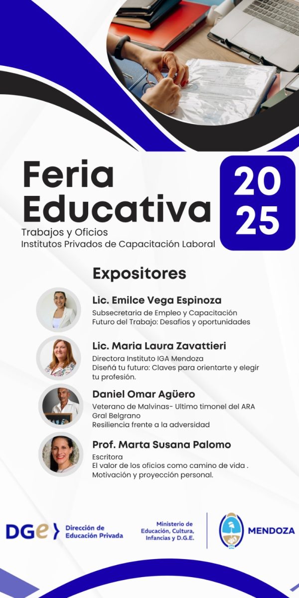 La Dirección General de Escuelas (DGE), a través de la Dirección de Educación Privada, invita a participar en la Feria Educativa 2025 “Trabajos y Oficios. Institutos Privados de Capacitación Laboral”, que tendrá lugar el jueves 23 de octubre, de 10 a 17, en el Espacio Cultural Julio Le Parc, de Guaymallén.