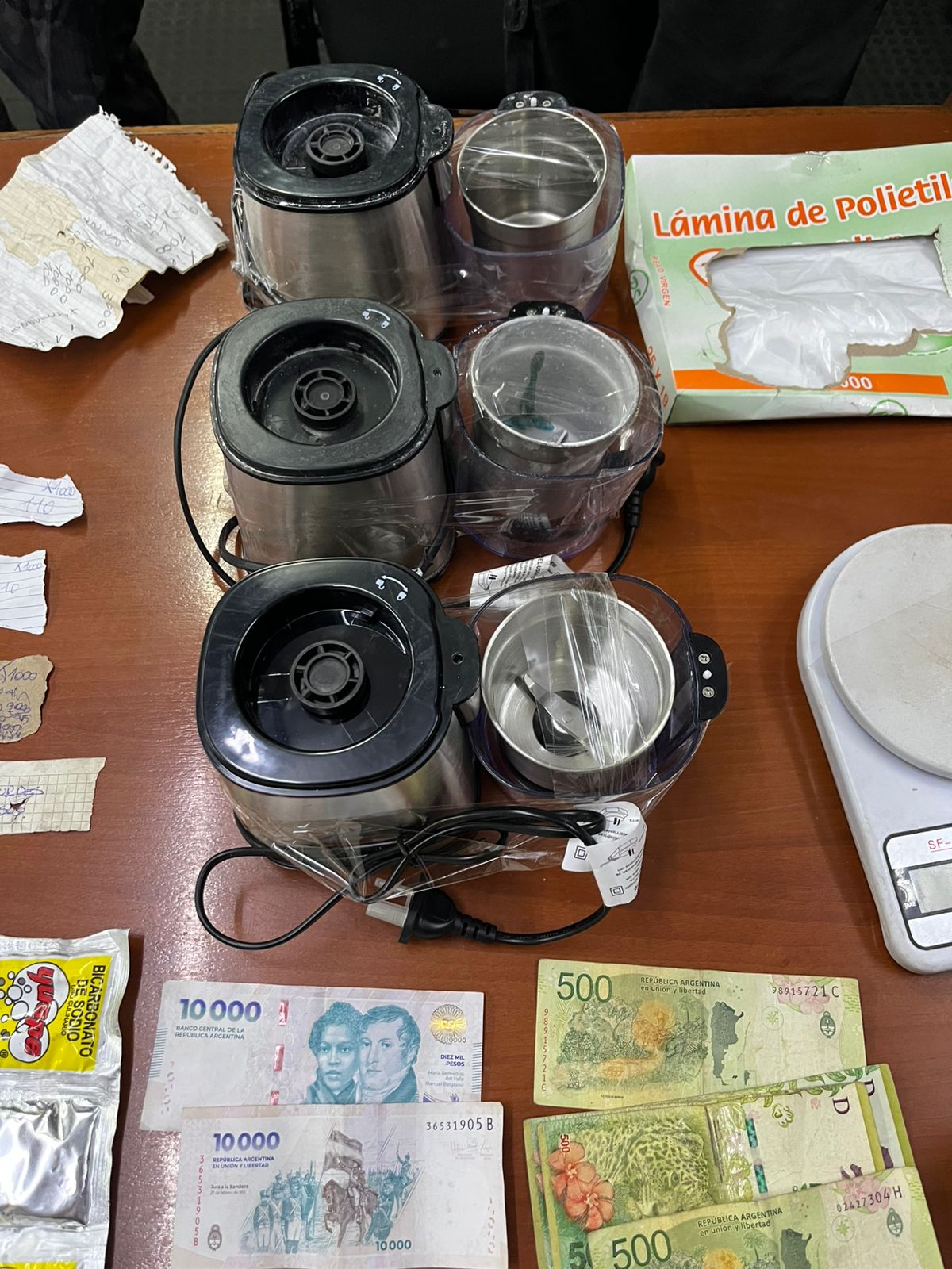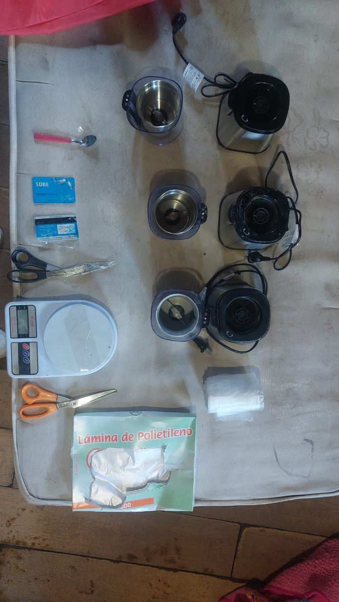 Más tarde, se concretó una segunda medida judicial en otra vivienda de la misma manzana del barrio Campo Papa. Allí se secuestraron tres máquinas multiprocesadoras con restos de sustancia que dieron positivo para cocaína, una balanza digital, un rollo de bolsas de nylon, láminas de polietileno, tijeras y otros elementos con restos de cocaína, además de anotaciones manuscritas vinculadas a la investigación.