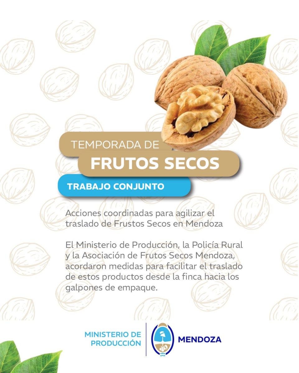 El Ministerio de Producción, junto a la Policía Rural y la Asociación de Frutos Secos Mendoza, avanza en un operativo integral para asegurar que el movimiento en las rutas provinciales se realice con la documentación correspondiente, prevenir ilícitos y acompañar a productores y procesadores durante el inicio de la cosecha.