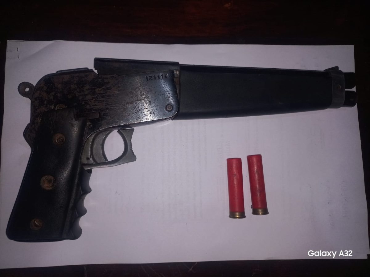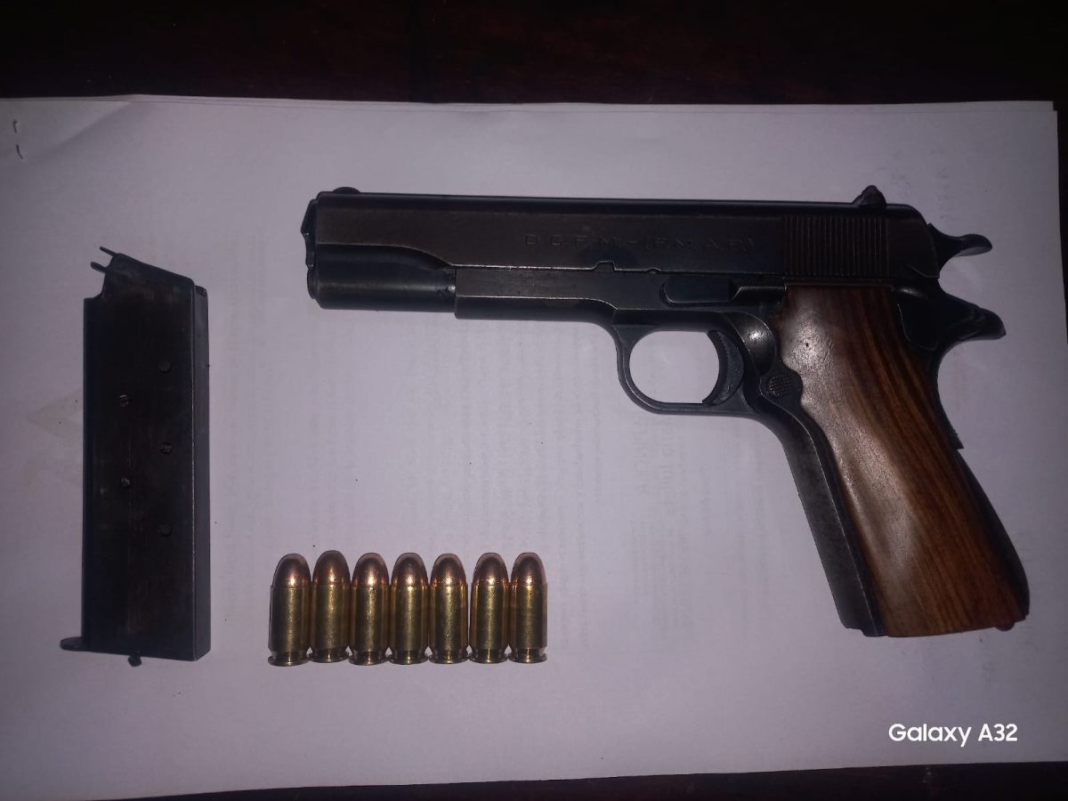 Entre los elementos incautados se encontraron chalecos portaplacas y antibalas con sus placas numeradas, esposas policiales, réplicas de armas de fuego y armas reales, entre ellas una pistola Colt modelo 1927 calibre 11.25 mm con cargador y siete cartuchos, y un arma calibre 32 de doble caño con dos cartuchos marca Orbea.