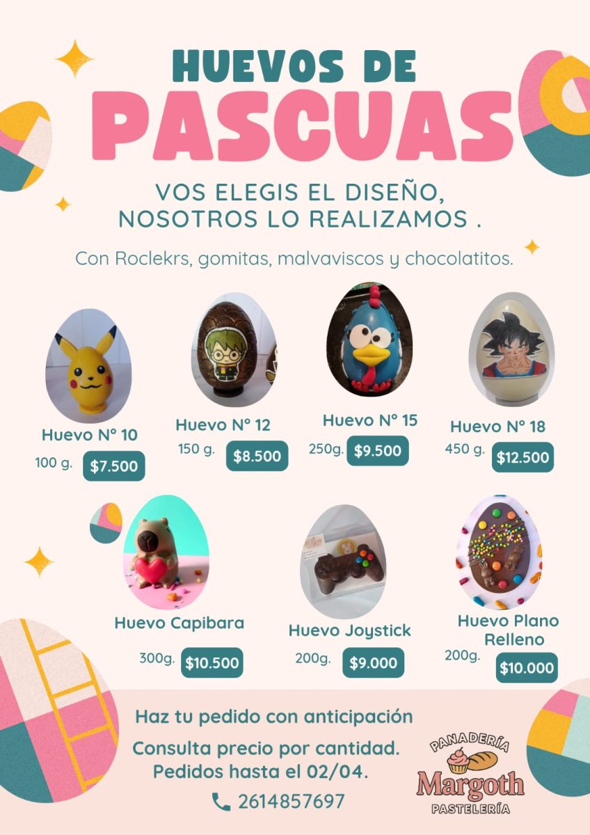 Además, el catálogo incluye las propuestas de Margoth, emprendimiento de panadería y pastelería artesanal, que ofrece huevos de Pascua personalizados, en distintos tamaños, diseños y rellenos, ideales para niñas, niños y toda la familia.