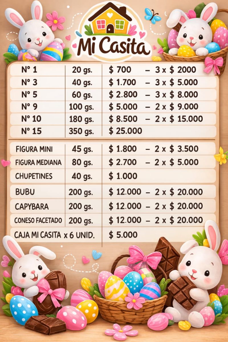 Entre los emprendimientos destacados se encuentra Mi Casita Chocolate, con amplia variedad de huevos de Pascua artesanales en chocolate con leche, blanco, semiamargo y marmolado. Los huevos número 7, 9, 10 y 15 están rellenos con lentejas de chocolate, maní con chocolate, huesitos y bombones, y cuidadosamente decorados. Además, los tamaños 20 y 25 incluyen rellenos especiales con bombones, lentejas de chocolate, huesitos, chupetines y gallinitas, ideales para regalar y compartir.