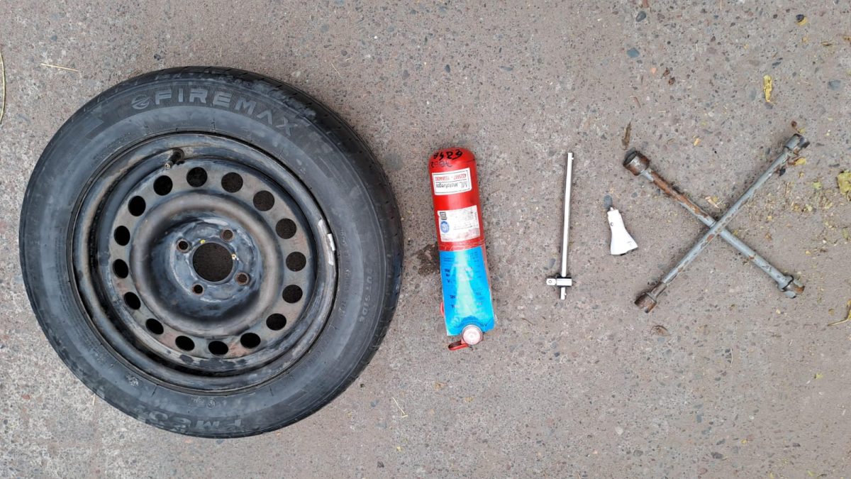 Entre los elementos recuperados se encuentran una rueda de auxilio, un matafuegos, una llave cruz, una billetera con documentación, un adaptador de carga y una ganzúa de fabricación casera, todos secuestrados en el procedimiento.