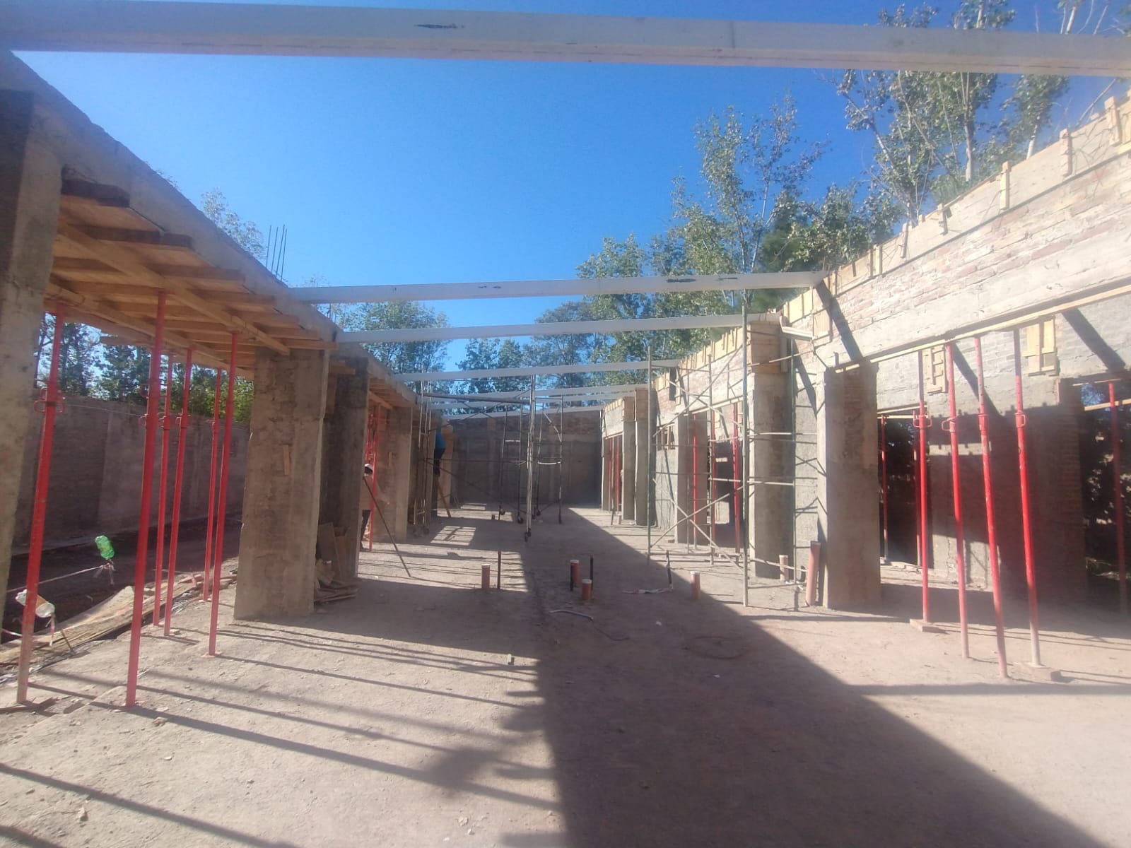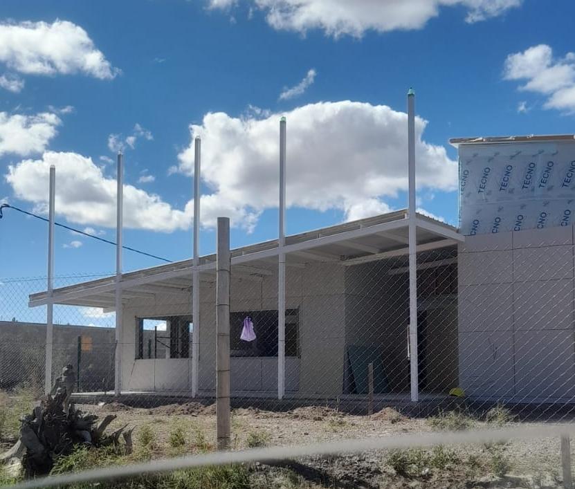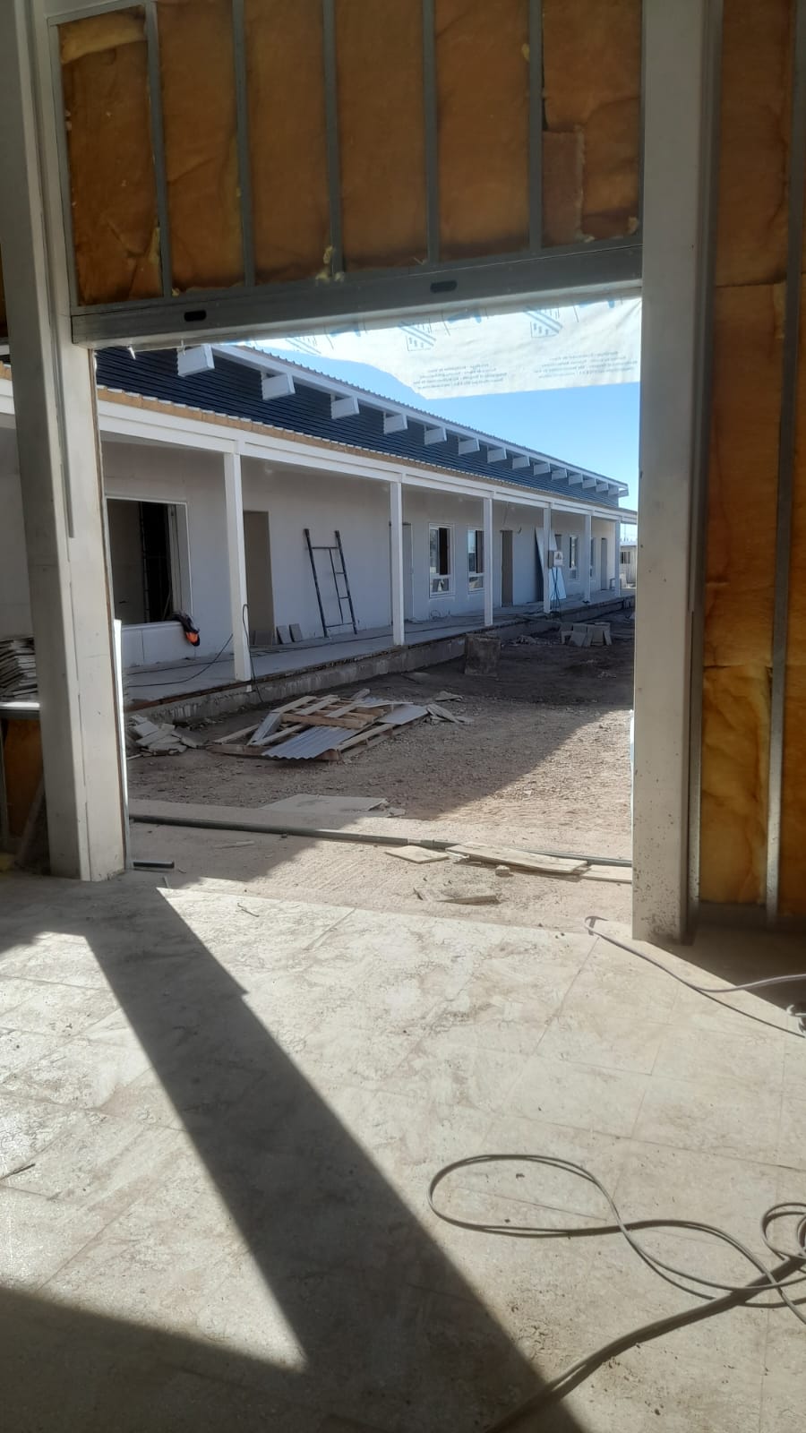 En paralelo, los equipos de trabajo avanzan con los revoques gruesos y el tendido de las instalaciones eléctricas. El edificio contará con tres salas con sanitarios propios, SUM y áreas de gobierno, con un sistema constructivo tradicional con cubierta metálica.