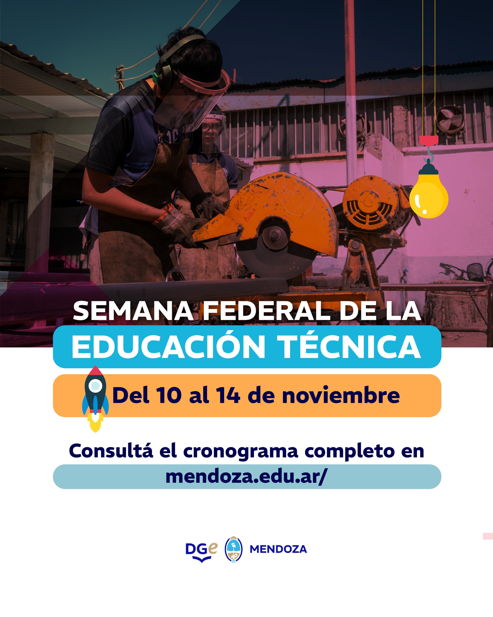 Del 10 al 14 de noviembre, Mendoza vivirá la Semana Federal de la Educación Técnica, una propuesta que reunirá a estudiantes, docentes y expertos en distintos puntos de la provincia para visibilizar proyectos innovadores y fortalecer el vínculo entre la escuela y el mundo del trabajo. El evento es organizado por la Dirección de Educación Superior y la Dirección de Educación Técnica y Trabajo de la Dirección General de Escuelas (DGE), con la participación de Institutos de Educación Superior, escuelas secundarias técnicas y Centros de Capacitación para el Trabajo (CCT).