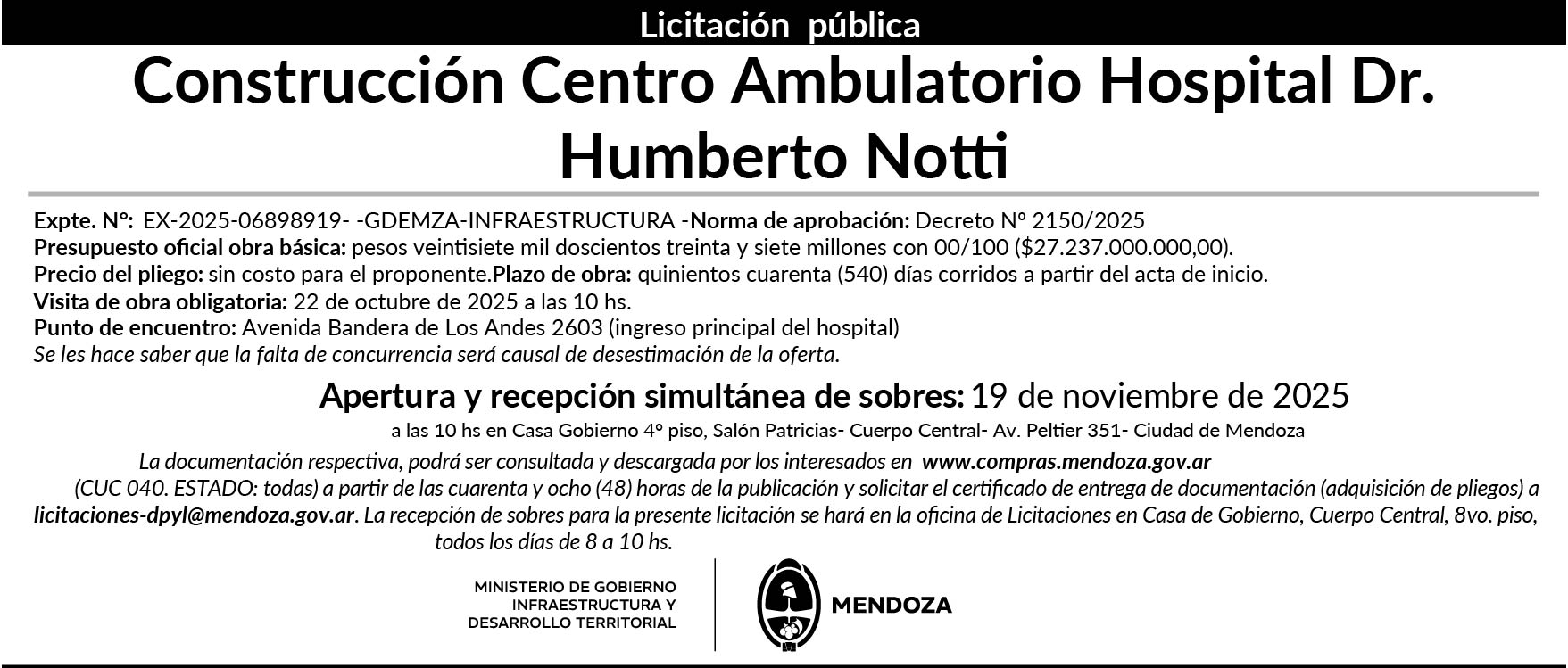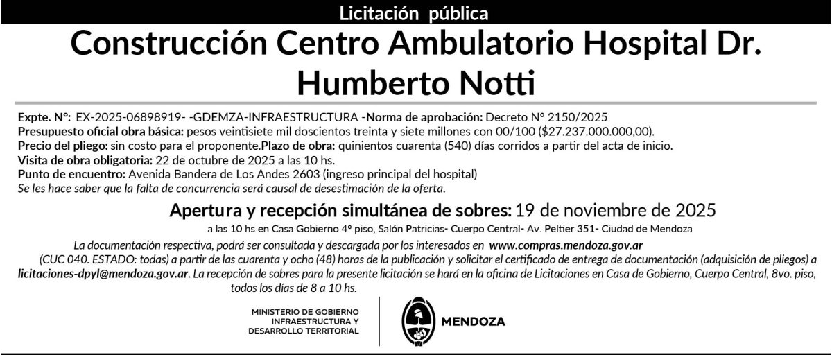 El Gobierno de Mendoza avanza con la licitación para construir el nuevo Centro Ambulatorio del Hospital Pediátrico Dr. Humberto Notti, una obra clave dentro del plan integral de modernización del hospital de referencia regional.