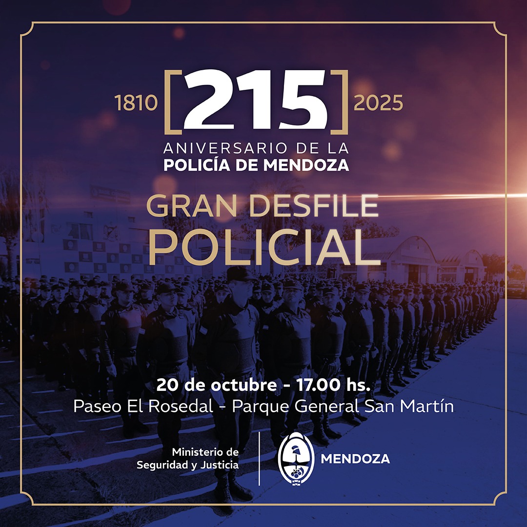 El próximo lunes 20 de octubre, a las 17, las calles de El Rosedal, en el Parque General San Martín, se vestirán de azul para celebrar más de dos siglos de historia de la Policía de Mendoza. El tradicional desfile contará con la participación de todas las divisiones policiales, entrega de premios al personal destacado y reconocimientos a los nuevos comisarios generales. Una jornada para rendir homenaje a quienes dedican su vida a proteger a los mendocinos.