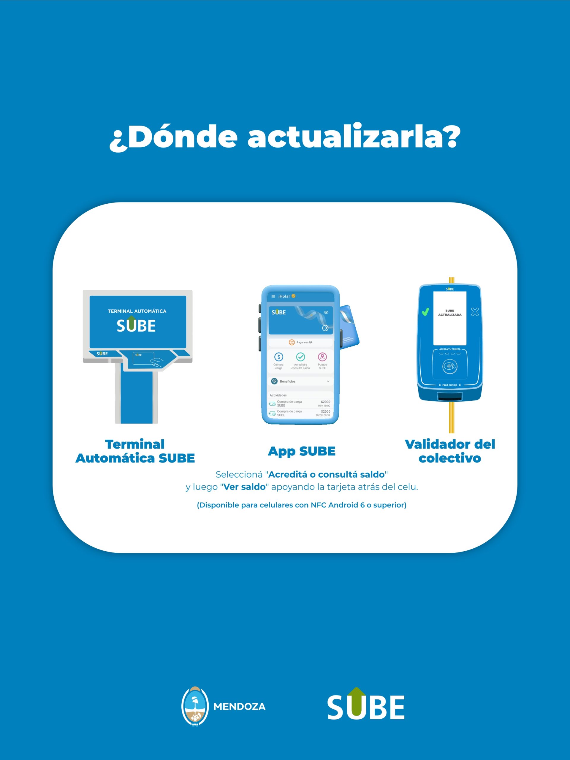 • App SUBE: seleccionar la opción “Acreditá y consultá saldo”, luego “Ver saldo” y apoyar la tarjeta en la parte de atrás del celular hasta que aparezca el mensaje “Tu tarjeta está actualizada”. Para utilizar esta funcionalidad es necesario contar con un teléfono con sistema operativo Android 6 o superior y tecnología NFC.