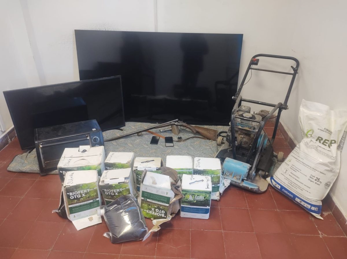 Entre los objetos recuperados se encuentran insecticidas y fertilizantes de distintas marcas y tamaños, un televisor de 75 pulgadas y otro de 50 pulgadas, un horno eléctrico, una compactadora y una escopeta antigua de doble caño con munición. También se secuestraron teléfonos celulares, junto a otros elementos relacionados con los delitos investigados.