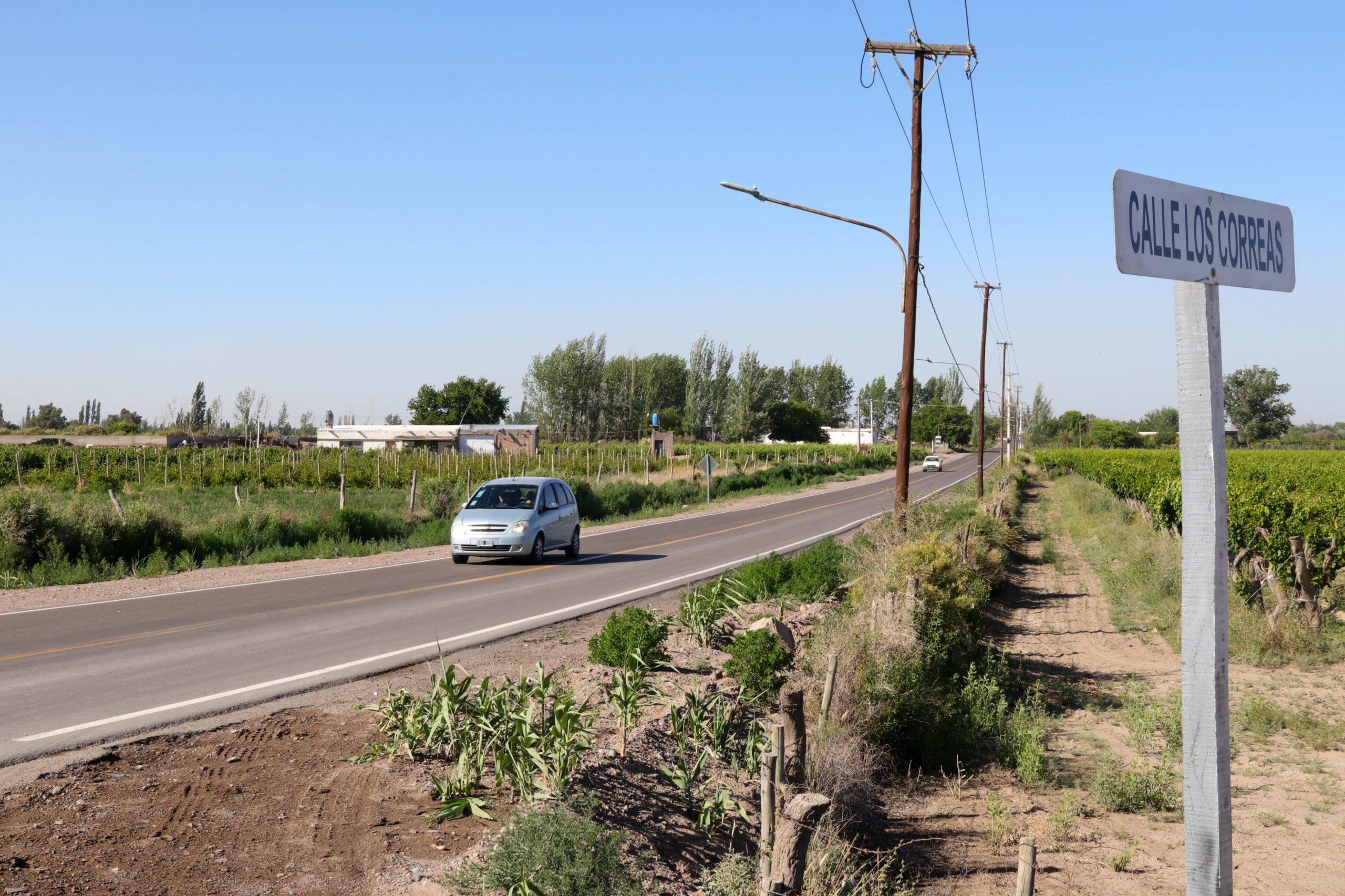 Vialidad Mendoza finalizó la renovación de calle Los Correas, una vía rural y enripiada de los departamentos de San Martín y Junín, que hoy, tras la obra, luce pavimentada, con demarcación horizontal, cartelería vial, y unos 120 equipos LED que la iluminan todas las noches en el recorrido intervenido.